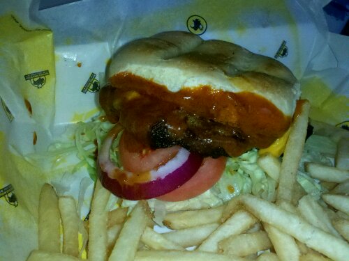 The beef appeared to be hand formed and had noticeable grill marks. It was not dry, but I wouldn’t call it juicy. On balance, it was just right given the high slop factor caused by the abundance of wing sauce. The burger had a good texture, and you felt you were biting into a substantial piece of cow. The cheese was a single slice, well melted onto the beef. The bun was neutral. It did not add to the burger, but it did not—unlike many others—detract.